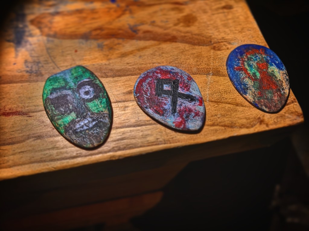 Odinn: round and full sound but collects also slightly metallic sound when in contact with the string. Good for picking. Kept the symbol facing your thumb.